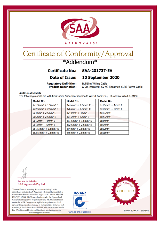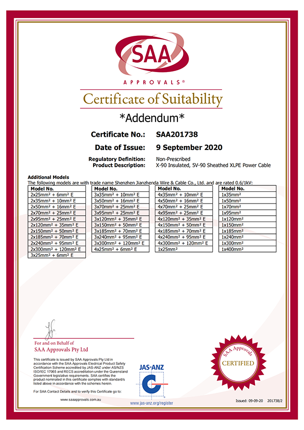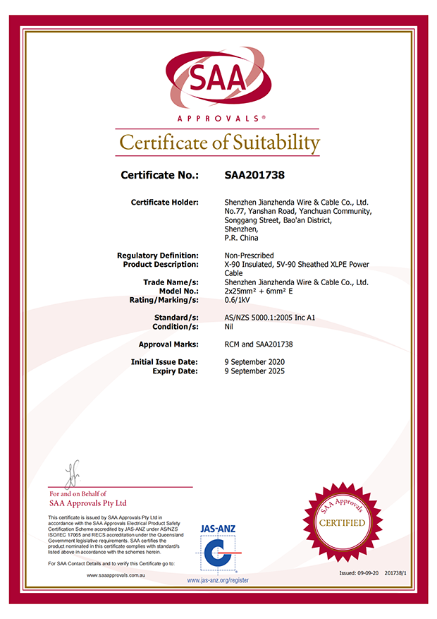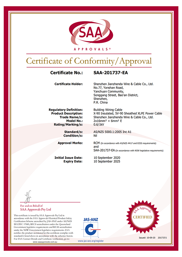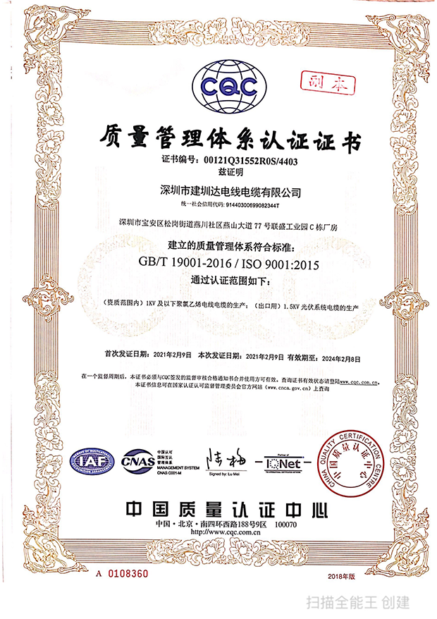 深圳建圳達電線電纜有限公司,成立于2000年,是一家電線電纜制造商,我們通過了世界各地不同市場的多數認證,如:CCC、RoHS、CB、SAA、TUV、VDE、PSE、BPS、UL、CSA。我們根據定制產品不斷更新新的認證。經過數十年的發(fā)展,我們與來自世界各地的客戶建立了長期的合作關系。我們曾經是菲律賓機場,,柬埔寨的電力站,美國的醫院,工廠,埃塞俄比亞的水電站項目。我們是一家值得信賴的電線供應商。